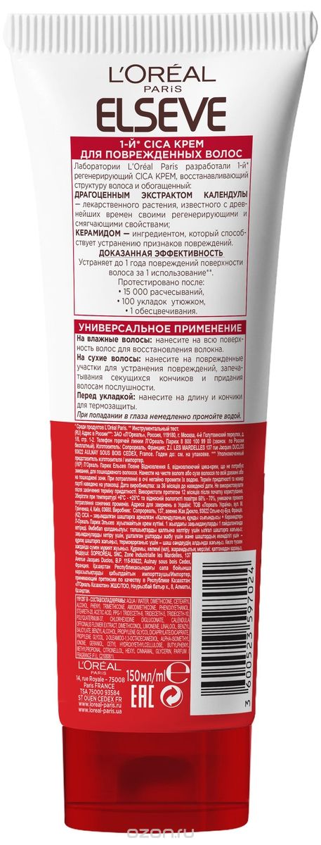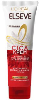 Лаборатории Loreal Paris разработали 1-й регенерирующий Cica крем для волос от Эльсев, восстанавливающий структуру волоса и обогащенный: драгоценным экстрактом календулы - лекарственного растения, известного с древнейших времен своими регенерирующими и смягчающими свойствами; Керамидом - ингредиентом, который способствует устранению признаков повреждений. Устраняет до 1 года повреждений поверхности волоса за 1 использование. Cпособ применения: Универсальное применение: На влажные волосы: нанесите на всю поверхность волос для восстановления волокна. На сухие волосы: нанесите на поврежденные участки для устранения повреждений, запечатывания секущихся кончиков и придания волосам послушности. Перед укладкой: нанесите на длину и кончики для термозащиты.
