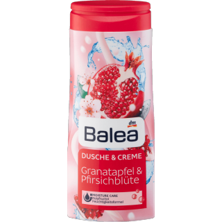 Balea крем для душа "Гранат и цветы персика" с ценным молочком и с формулой PolyFructol по уходу за вашей кожей приятно заботится о вашей коже и соблазняет фруктово-цветочным ароматом. В то же время эффективно увлажняет кожу и защищает ее от сухости.